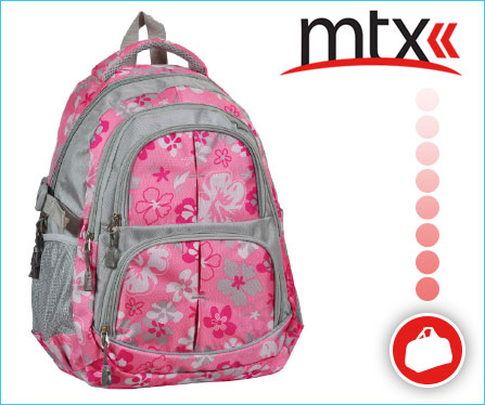 Línea escolar y viajes mochila 17" floreada  | | 201124 | |  | | 00006938 | |  | | 25 unidades | | | | |  | | Medidas: 68 x 43 x 45 cm Colores: rosado/plomo 4 compartimentos, cierre reforzado, marca MTX |